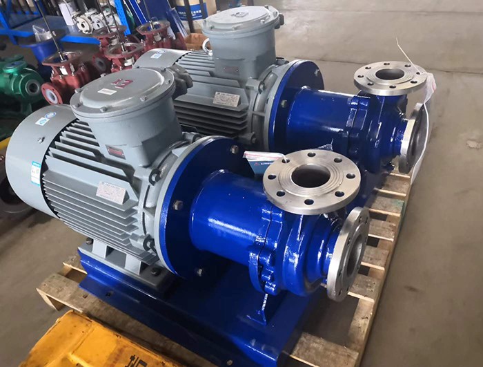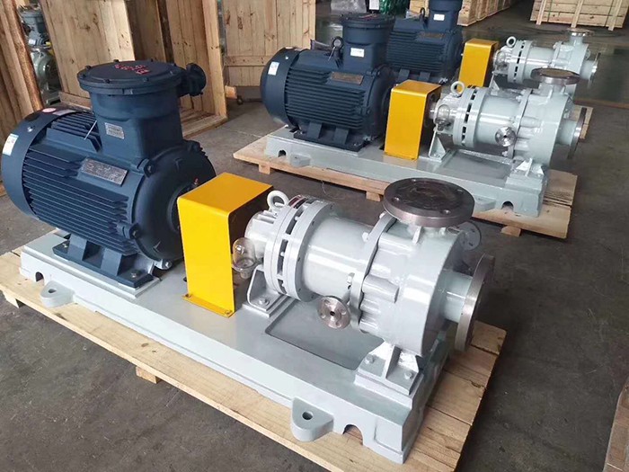 磁力泵是利用永磁聯軸器工作原理無接觸的傳遞扭矩的新型泵,當原動機帶動外磁鋼轉動時,通過磁場的作用驅動內磁鋼轉子同步旋轉,而內磁鋼轉子和葉輪連成一體,從而達到無接觸帶動葉輪轉動之目的。由於液體被封閉在靜止的隔離套內,所以磁力泵是一種全封閉、無泄漏的產品,因此完全避免了機械密封離心泵不可避免的跑、冒、滴、漏的弊病。